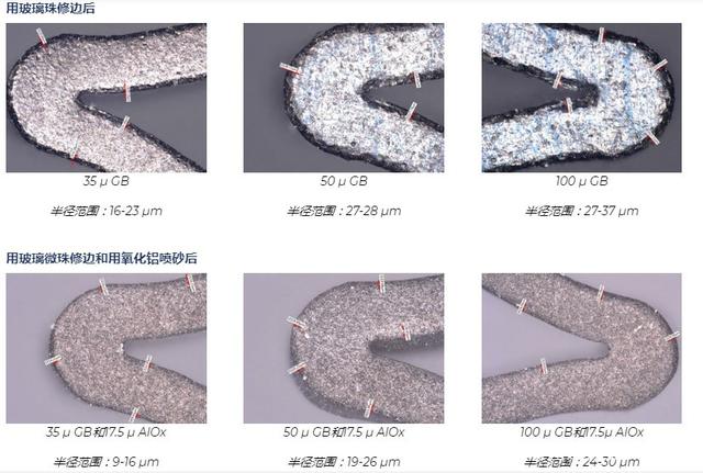 經(jīng)過吉川公司工藝工程師測試,用氧化鋁砂進(jìn)行定向的噴砂處理可以去除氧化層,平滑表面缺陷并改善外圍支架的表面質(zhì)量。支架的受損區(qū)域很脆,但基礎(chǔ)材料鎳鈦諾卻具有延展性。氧化鋁噴砂磨料使用去氧化層,并且對韌性基體的侵蝕最小,從而在支架撐桿的整個長度上形成均勻的表面光潔度。 市場最新的支架設(shè)計和醫(yī)療植入物要求更大的邊緣倒圓角。圓形邊緣降低了被植入物卡住,其他風(fēng)險的可能性。氧化鋁微噴丸的半徑為5-15 m,但新的幾何尺寸指定為接近25 m。該半徑可以通過三種途徑實現(xiàn):延長噴砂周期,使用更大尺寸的氧化鋁或完全使用其他磨料。通過測試,我們了解到更長的噴砂周期可以去除更多的團(tuán)塊,而較大尺寸的氧化鋁會產(chǎn)生過于粗糙而無法拋光的表面。畢竟,氧化鋁顆粒的形狀為塊狀,邊緣稍尖。這給了我們一個可行的選擇:嘗試使用其他類型的磨料。為了克服這一障礙,我們測試了幾種類型的介質(zhì),發(fā)現(xiàn)用玻璃珠噴砂可以在拐角處形成所需的半徑(最大30 m),而不會除去設(shè)備的額外質(zhì)量。結(jié)果是氧化鋁的質(zhì)量提高了十倍。經(jīng)過吉川公司工藝工程師的測試事實說明了結(jié)果的差異。用氧化鋁噴砂處理過的樣品的半徑僅為8-13 m,而用玻璃珠噴砂處理過的樣品的半徑為24-30 m。 經(jīng)過吉川公司工藝工程師最終測試事實證明,最好的心臟支架噴砂工藝需要用氧化鋁砂粗噴砂、再用玻璃珠微噴砂是目前最好的一種噴砂工藝方式。 經(jīng)過粗噴、微噴的產(chǎn)品外徑和內(nèi)徑轉(zhuǎn)角處的半徑可以實現(xiàn),而所需的附加材料去除最少。半徑的大小可以有效地控制,因為它是基于圓形磨料,玻璃珠的大小和速度的。可以控制具有附加半徑的支架區(qū)域。通過機(jī)械加工表面,有助于保持支架的疲勞壽命。玻璃珠磨料通常用于必須保持嚴(yán)格公差的噴丸處理應(yīng)用中。玻璃珠對支架表面進(jìn)行噴丸處理,不會去除任何材料或數(shù)量可忽略不計的材料。如下所示,玻璃珠的尺寸很重要。玻璃珠的尺寸越大;邊緣越圓。玻璃珠有35 ,50 和100 兩種。讓我們看一下使用每種尺寸的樣本測試的結(jié)果。此處顯示的未噴砂的支架表面(500x)邊緣鋒利,并受到制造損壞。半徑范圍僅為3-8 m。為什么用兩種磨料處理比單獨(dú)用氧化鋁處理好? 玻璃珠無法消除制造過程中產(chǎn)生的浮渣,回彈和其他損壞;只有氧化鋁可以。氧化鋁不能產(chǎn)生真正的圓形邊緣。但是,它確實可以提供電拋光所需的理想表面光潔度。一個不能替代另一個。通過使用多步驟過程,植入物表面可以使用經(jīng)過驗證的相同設(shè)備獲得兩全其美的效果。在該過程中添加第二種研磨劑聽起來可能需要更多的勞動力,但實際上比其他修邊過程更有效。例如,電拋光可以產(chǎn)生較大的半徑,但它也會從整個零件中去除過多的材料,而不僅僅是角部,從而損害了支架的疲勞壽命。